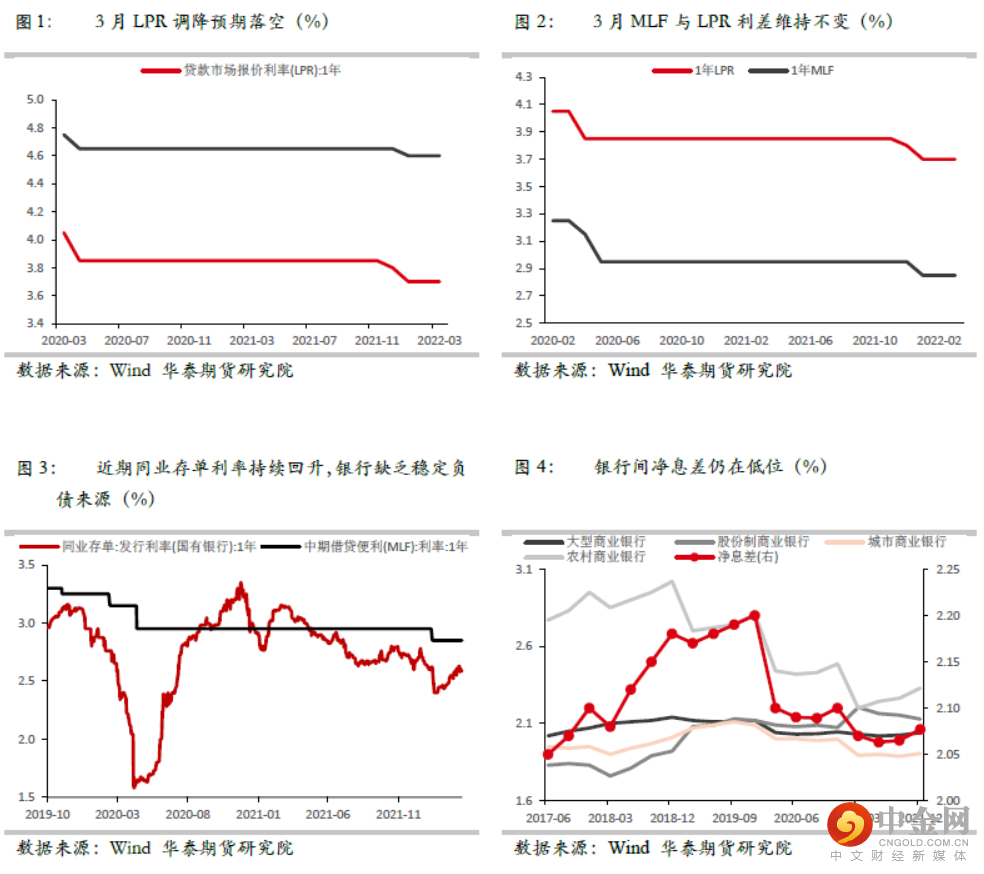 LPR调降预期落空,央行总量宽松操作较为谨慎。3月公布1年期与5年期LPR未调降,连续两个月持平。市场部分降息预期落空,但符合我们此前的预期。此前我们强调,由于银行端净息差处于历史低位,且银行缺乏稳定的负债来源,近期存单利率明显上行。在MLF未调降的背景下,银行主动压缩LPR加点概率不大。同时,由于LPR降息具有全市场普适性,政策信号意义明显,因此央行在引导LPR降息是顾虑较多。当前,在外部俄乌争端未平、美联储开启加息,内部疫情持续扰动的背景下,内外局势均存在较大的变数,并非最佳降息时期,开启全面宽松政策助力稳增长的性价比不高。