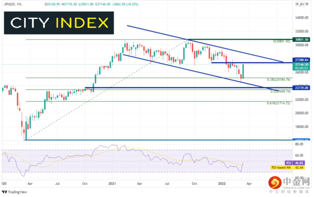 日经225指数上周上涨8.25%,斩获2020年3月以来最大涨幅。该大盘股指自2020年3月低点15997开始上涨,于2021年2月16日当周创下30724高点。经过回撤后于2021年9月测试前述高点并在30801.5形成略微上抬的新高。自那以后,该股指下跌并形成下降通道,考验了2020年3月低点到2021年9月高点行情的38.2%回档位,即25136.8附近,然后在上周强力回升。上方阻力有略高于当前价位的水平阻力位27380附近,然后是下降通道的上轨趋势线28800附近,接着是30801.5高点。支撑位在2周前以来低点24497,那也是前述通道的下轨趋势线,然后是由前高点和前述行情的50%回档位形成的支撑区间23459-23739,接着是61.8%回档位21714附近。