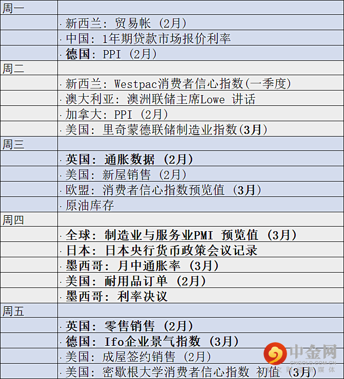 本周经济日历清淡,3月数据的发布时间在3月份比较分散。本周英国除了通胀数据外还将发布零售销售报告。本周将要揭晓的其它数据有澳大利亚、欧元区、英国和美国的PMI预览值。这些数据将初步透露制造业与服务业在俄罗斯入侵乌克兰与油价飚升后的变化情况。本周重要经济数据详情如下: