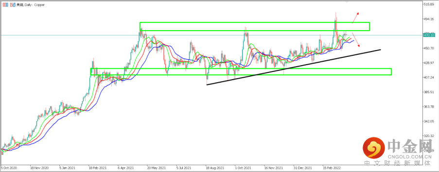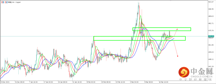 2. Copper美铜:美铜这边近三个交易日小幅震荡,从去年5月份美铜触及高位490美分/磅之后美铜近一年来基本呈现一个横向震荡的形态。从天图周期来看,震荡区间顶部大约位于490美分附近,二震荡区间底部大约位于410美分附近。目前价格盘踞于470美分附近接近震荡区间顶部位置,如价格在此受到压制下跌,有可能测试450美分附近支撑。反之价格如果一举有效突破490美分阻力区间,则有望继续上行测试前高504美分附近。4小时周期来看,目前短期美铜重要支撑区间位于468美分区间,如价格在此企稳,有望上测478美分阻力,反之价格跌破该支撑,则下方第二支撑区间位于452美分附近。目前价格正位于470美分一线附近运行。