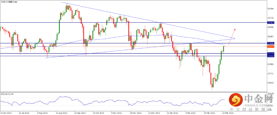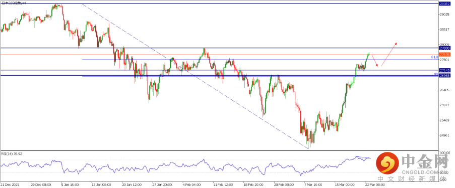 1.JPN225 日经225: 据中国媒体报道,俄罗斯将继续通过乌克兰向欧洲输送天然气,乌克兰总统泽连斯基称准备讨论不寻求加入北约的承诺,隔夜全球股市呈现普涨。截止到昨日欧美股指均收复2月24日俄乌冲突爆发以来的跌幅,其中日经指数收盘于27675,已经接近2月9日高点27888。技术面日图可见,指数在3月8日触底后强势反弹,目前接近200日均线和前述27888位置。如果今日能延续涨势,估计可以轻松突破该区间,下一目标位看向1月4日高点29382左右。聚焦4小时图,RSI指标超买和顶背离,假如发生短期回撤,可能会测试斐波那契61.8%回调位27508以及下方支撑位27145和26968(FIBO50%)左右位置。