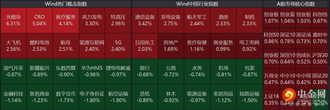 盘面上,受《“十四五”现代能源体系规划》刺激,风力发电、特高压、发电设备板块涨幅居前。CRO、医疗服务、制药板块反弹,表现亮眼。酒类板块受茅台拉动,涨幅可观。航天军工板块上扬。午后,房地产板块再度发力,多股涨停。氢能相关板块造好。光模块、5G、半导体、通信设备板块受中兴通讯复牌涨停消息刺激,涨幅居前。航空运输、家居用品、能源设备等板块跌幅居前。