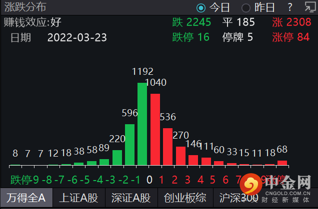 个股涨跌参半,赚钱效应好。Wind数据显示,沪深两市共上涨2308只,下跌2245只,其中,涨停个股84只,跌停个股16只。