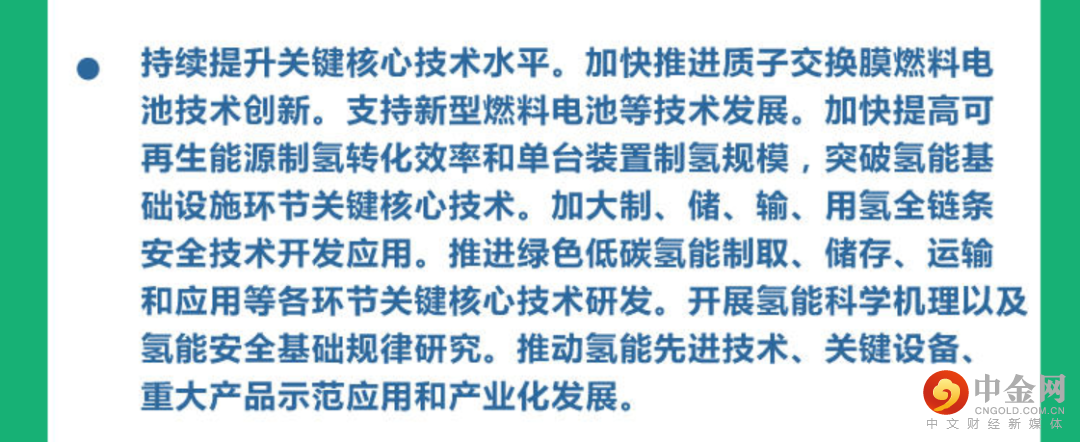 技术层面,《中长期规划》重点提及了“质子交换膜燃料电池技术”、“新型燃料电池技术”、“氢能基础设施环节核心技术”和“绿色低碳氢能制取、储存、运输和应用等各环节关键核心技术”。