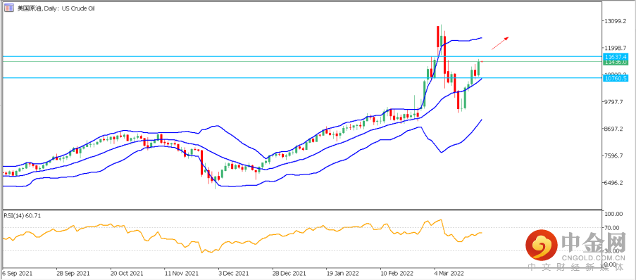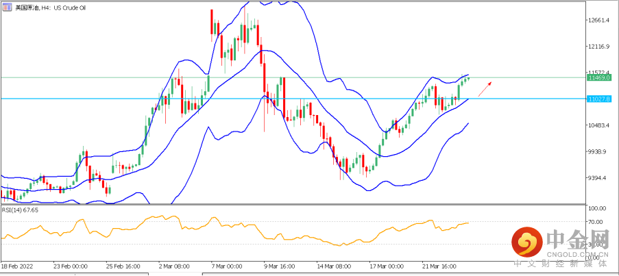 4. 美国原油US Oil:美油昨日涨超5%创逾两周新高。日图技术面来看,RSI强弱指标目前处于中性,预示后市还有上涨空间。再结合4小时分图,日内关键看涨支撑位于布林带中轨110处,若价格稳于该位之上,则保持看涨,上方第一压力位关注117附近,若强势上破,则后市可能再次挑战120及124潜在目标。若日内价格跌破110处支撑,则可能下探布林带下轨105处寻求支撑。
