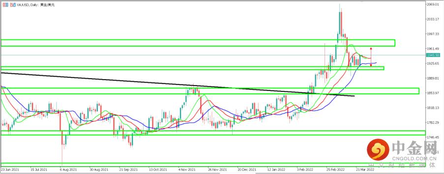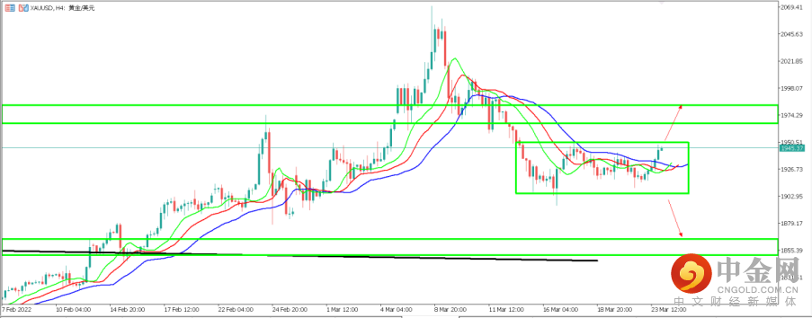 3. 黄金兑美元 XAUUSD:黄金昨日录得30美元左右的上涨,近5个交易日来价格持续在1915-1950区间震荡。从天图周期来看,目前黄金在鳄鱼指标慢线之上以及天图支撑区间1910-1920附近企稳,鳄鱼指标的快线也开始向上穿越中线,表明价格很可能还有进一步反弹的空间。天图上方阻力区间大约位于1960-1970附近。从天图上看黄金如进一步反弹将测试该区间阻力。从4小时周期来看,目前黄金处于震荡区间1905-1950顶部位置,如黄金向上突破该区间,则大概率上测1970附近阻力区间,反之如黄金跌破该区间,则下方支撑区间位于1860附近区间。目前价格正位于1945一线附近运行。