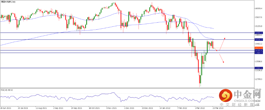1.德指 GER40: 隔夜欧美股市回落,道指两周多来首次一日跌超400点,欧股仅商品相关板块上涨,其中德指下跌319点,跌幅-2.2%。消息面俄乌谈判遇到“重大困难”,同时原油和天然气走高重燃通胀担忧。技术面日图可见,德指目前运行到50日均线14590位置遇阻,我们的偏见是本次回落可能是暂时性的,如果短期再测试14100-13989区间也获得有效支撑,则可以继续保持看涨,上方压力位在14590和14900左右位置。反之,如果价格跌破13989,则看涨失效,空头下方目标位可以看向13300位置。