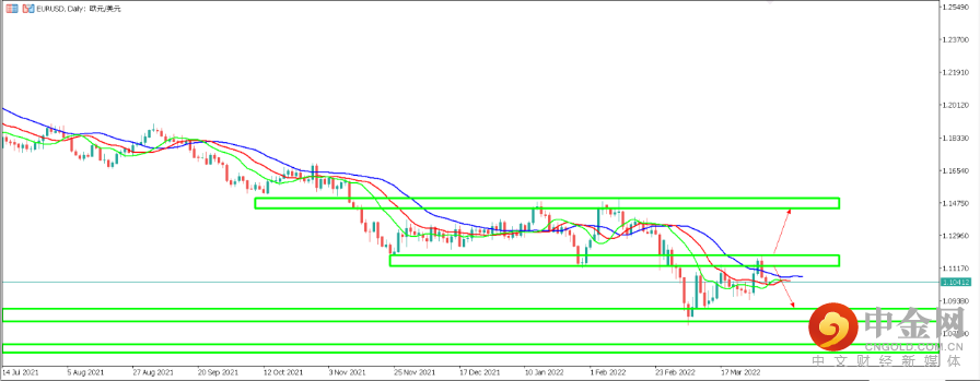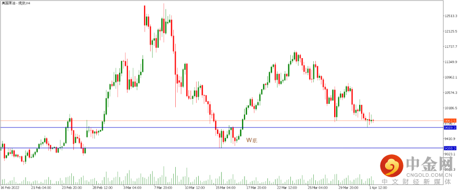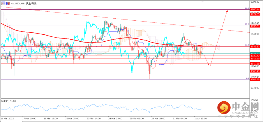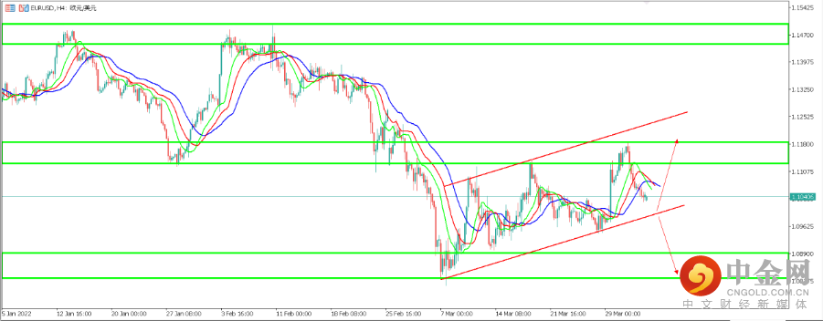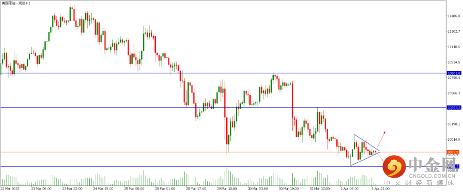 1.USOIL:受拜登政府准备几个月内从战略石油储备(SPR)中释放多达1.8亿桶石油影响,原油上周五继续下跌。技术面4小时图可见,价格盘中已突破3月29日低点98.28,最低触及3月15-17日W底颈线位置96.89,但当日收盘于98.62。如果今日价格跌落96.89,我们的偏见是短期看跌,下方第一支撑位看向91.68左右位置,然后是2021年10月高点85区域。聚焦1小时图,上个交易日原油在走对称三角整理,目前价格已经达到三角末端,今日如果价格往上突破,则第一目标位可以看向103.93左右,然后是3月30日高点压力支撑互换位108.00左右位置。