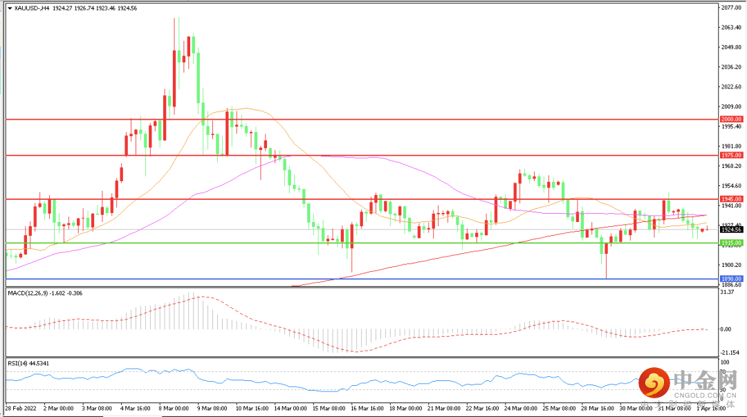 上周公布的包括非农在内的多项美国经济数据,夯实了美联储5月加速升息前景,进而利空金价,现货黄金延续区间震荡形态,收报1924.55美元/盎司。