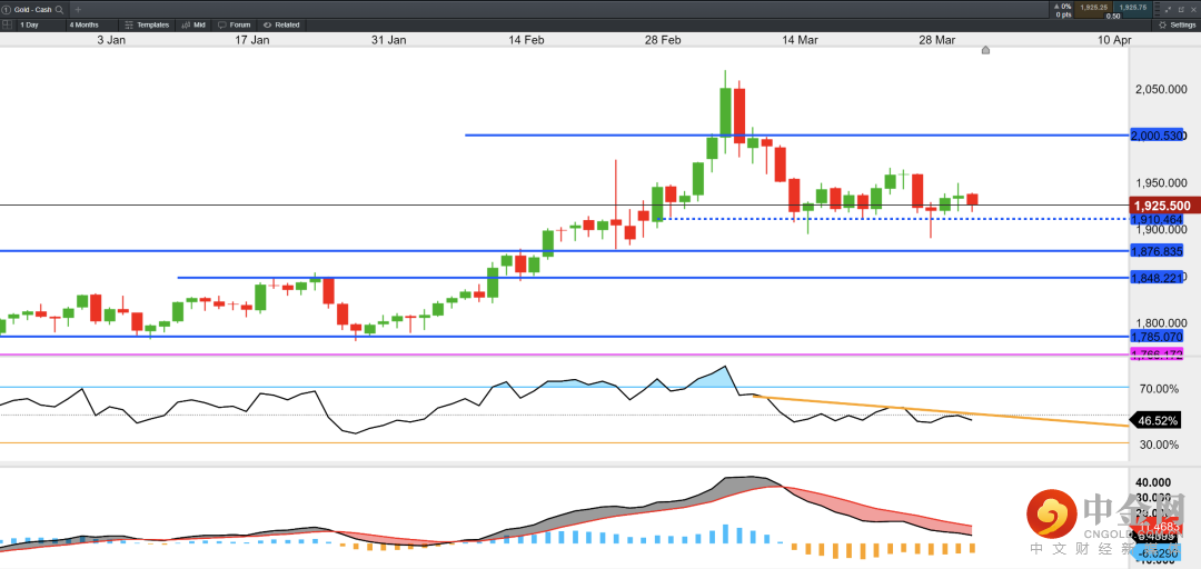 黄金自3月16日触底1894.98美元后,进行长达两周的震荡趋势,但从目前的震荡幅度和K线形态来看,短期仍有进一步向下的回落风险。