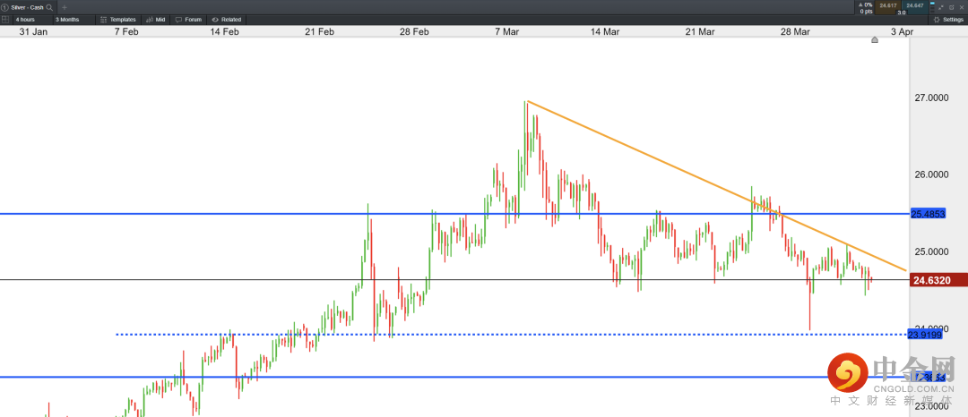 相较于黄金,白银的多头趋势明显呈现更加弱势的表现,反弹的力度在逐渐衰弱,价格有进一步回落风险,投资者参考下方整数支撑24,其次是23.36,然后是22。