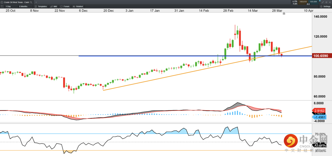 从日线级别来看,美国原油的多头动能短期也出现衰竭的迹象,目前价格已经运行于上行趋势线的下方,多空对于100这一关键位置仍然处于争夺阶段,投资者需密切关注该区域。