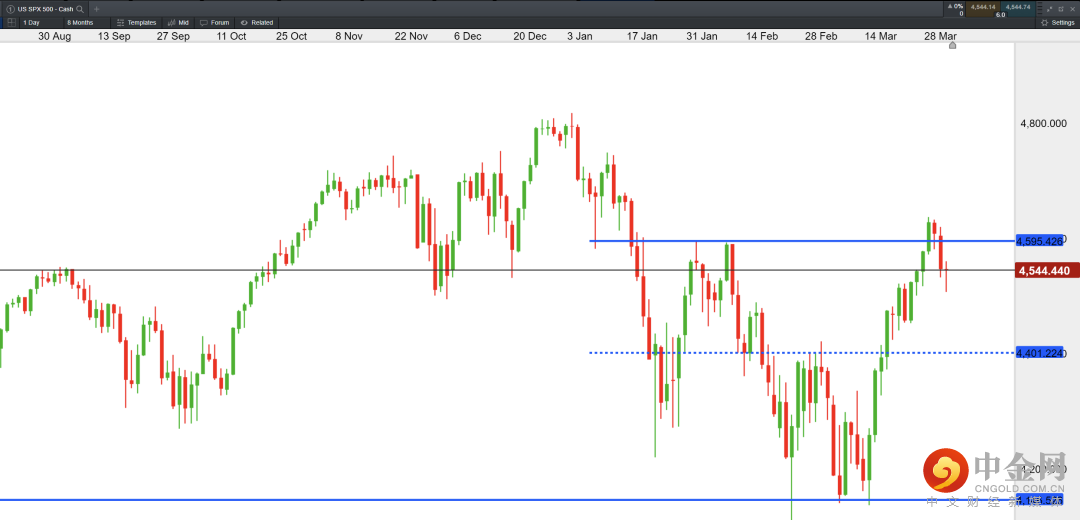 标普500指数已经触及之前目标位4600,最高曾涨至4637.56。而从现在来看,多头已经有所衰竭,投资者需关注多头是否能再次挑战4600成功,如若不成,该区域或将成为阶段性终点。