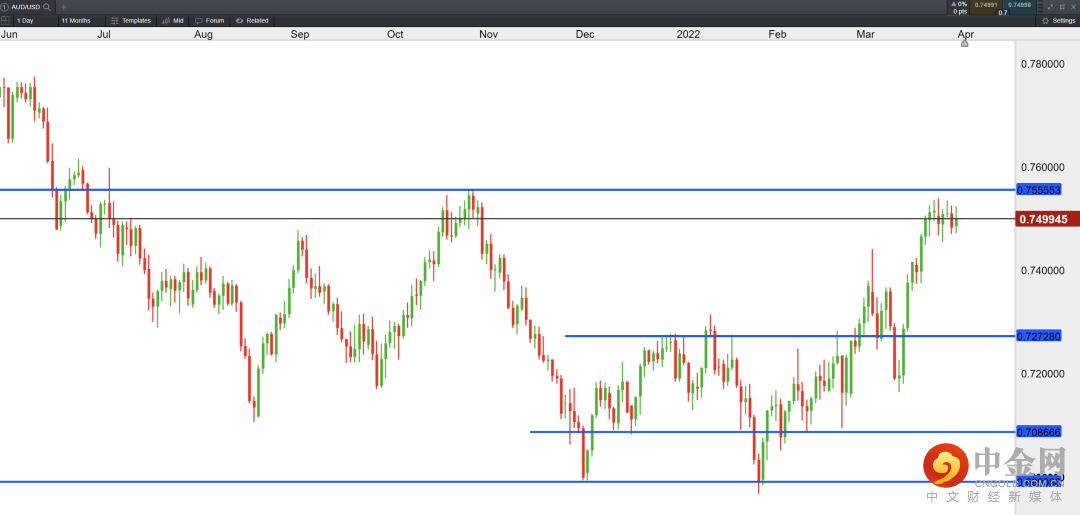 澳元兑美元在日线级别距离先前目标区域0.755仅差10个点,但价格多日并未形成突破,目前处于震荡区域。结合当前环境,澳联储预计本周继续维持鸽派言论,而美联储加速紧缩预期愈演愈烈,这也会对澳元形成压力,因此,该区域或成为阶段性反弹终点。