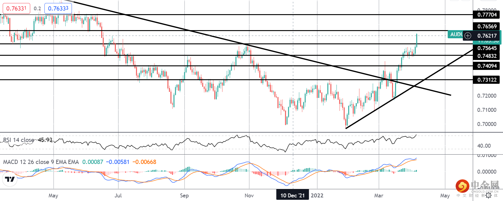 澳元兑美元看跌趋势线上方的突破现在正在积聚强劲势头。价格已突破 2021 年 10 月高点 0.7564,并且随着 MACD 和 RSI 坚定看涨,焦点是继续走高,同时价格保持在该水平之上。现在的重点是测试 0.7656 水平,如果我们继续走高,0.7770 是多头的下一个目标。