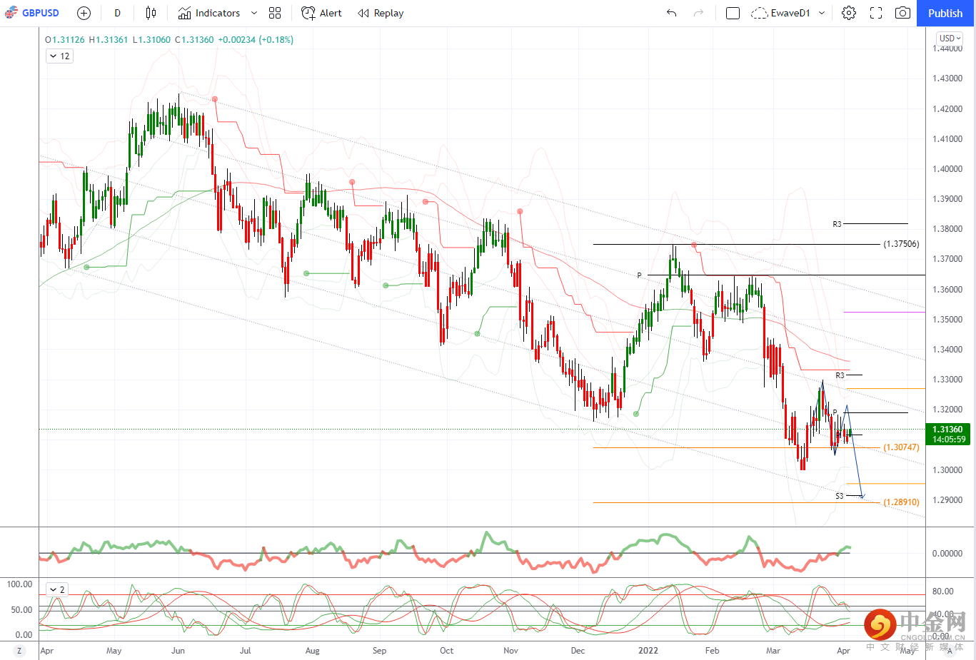 第一个主要支撑是 1.3011 21 天波利波段下方,然后是 1.3000 2022 低点