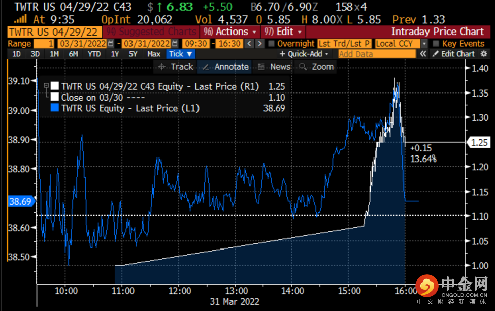 2022年3月31日的日内交易图表:推特公司股票(蓝色)与推特公司4月29日到期的看涨期权(白色)
