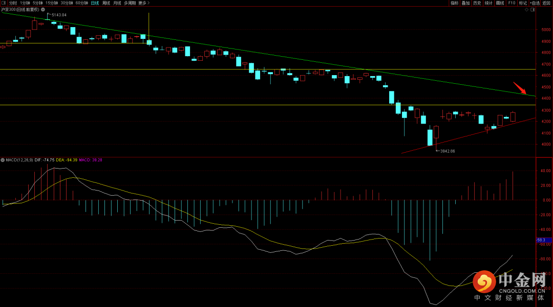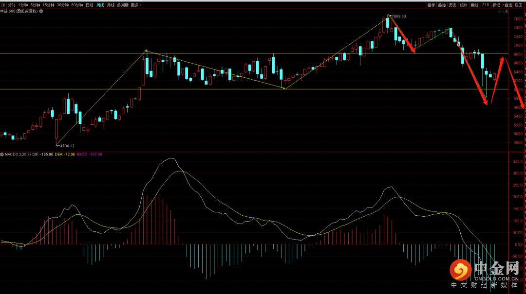 中证500短期从结构看正在走周线的反弹一笔,大概率会反弹到6600到6780这个区间后再走一笔向下的走势,后续行情一旦触碰到6600以上就需要开始注意日线结构何时出现完结。