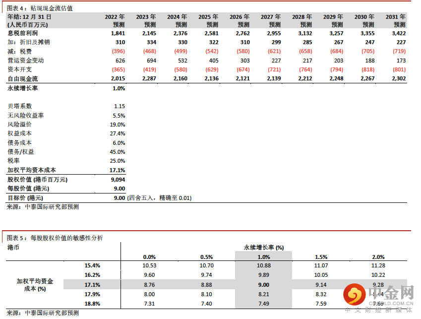 为反映近期资本市场不明朗性的因素,提升风险溢价假设,我们将贴现现金流(DCF)分析推算的目标价由 10.00 港元下调至 9.00 港元,这对应 6.3 倍 2022 年市盈率及 63.3%上升空间(见图表 4 及 5)。重申“买入”评级。