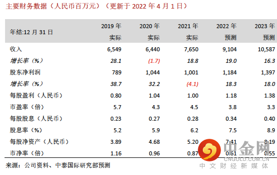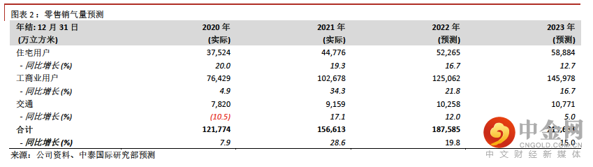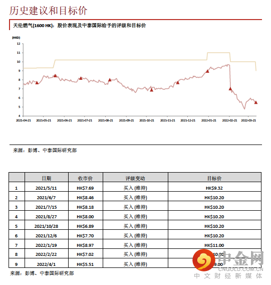 公司就 2022 年零售销气量定下 20-25%同比增长目标,低于 2021 年实际增长率,但远高于我们原本的14.4%升幅假设。另一方面,地缘政治风险今年加剧,预计天然气上游持续涨价,导致公司今年毛利率受压。综合上述因素,我们微降 2022 年股东净利润预测