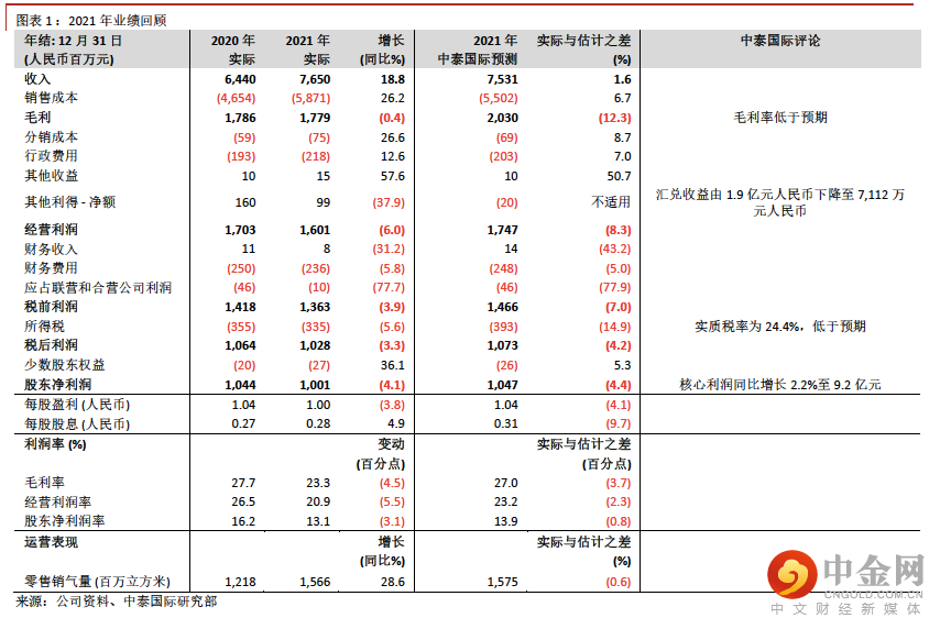 公司近日公布略逊预期的 2021 年业绩。股东净利润同比下跌 4.1%至 10.0 亿元人民币(下同),分别相对市场及我们预测的 10.2 亿元及 10.5 亿元,低出 1.6%及 4.4%,主因:(一) 天然气上游涨价但用户顺价延迟,导致零售销气毛差同比下跌 12.5%或 0.07 元至 0.49 元/ 立方米。毛利率下跌 4.5 个百分点至 23.3%;(二)去年 7 月中旬河南省特大水灾造成乡镇接驳工程约一个季度延误(见图表 1)。如扣除其他收益及亏损,核心利润同比上涨 2.2%至9.2 亿元。零售销气量同比上涨 28.6%,略低于我们预计的 29.3%升幅,但高于公司去年中公布的 25.0%升幅目标。其中,居民及工商用户销气量分别同比增长 19.3%及 34.3%。