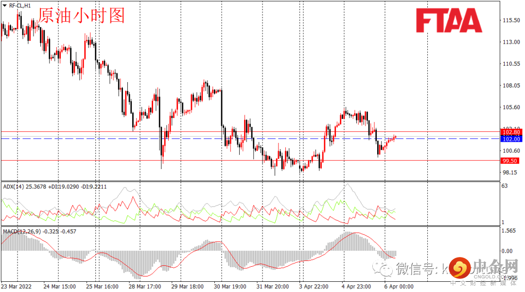 原油周二下跌,最高105.57,最低99.86,日图收出上影中阴,显示短期空头主导,跌幅超过此前阳线的50%,日图级别或维持震荡偏空。小时图看,昨日亚欧盘震荡后,小级别产生背离,美盘时段持续下跌。美联储官员密集偏空言论对油价构成压制,冲抵了俄乌局势对能源市场影响。当前MACD指标重新翻绿,日内或维持弱势震荡。今早亚盘油价持续反弹。短线或维持震荡。操作上可持有空单,或现价附近轻仓空,止损102.80,目标99.50。