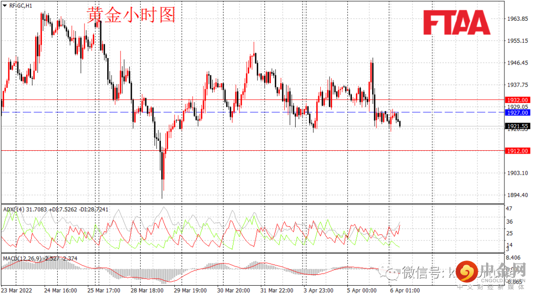 黄金期货周二震荡下跌,最高1948.50,最低1920.85,日图收出长上影中阴,显示短期多头发力,但最终空头主导,日图级别或维持震荡偏弱。昨日金价亚欧盘震荡后,美盘盘前一度大幅拉升,但随后跳水。俄乌局势对避险情绪影响淡化,美联储密集鹰派言论打压金价下行。当前MACD指标绿盘,小时图形态倒V反转,短线或延续弱势。今早亚盘金价小幅反弹后,当前回落,操作上可持有空单,或逢高在1927附近轻仓空,止损1932,目标1912。