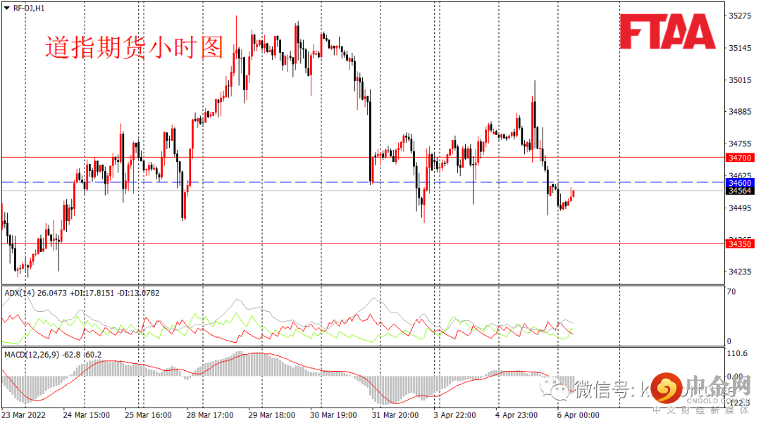 周二美股三大指数集体下跌,纳指跌超2%,道指跌280点或0.80%。美联储官员近期纷纷释放鹰派信号,同时俄乌局势依旧没有缓和,欧美继续升级对俄制裁,俄罗斯则表示强硬,乌总统则突然改口称希望加入北约。道指早盘冲高后持续走低,日图收出上影中阴,显示空头主导,日图或延续调整。道指期货方面,昨日亚盘震荡,欧盘回落,美盘早盘拉高随后大幅调回。当前MACD指标翻绿,ADX指标抬升,短线或延续震荡跌势。今早亚盘道指期货惯性下探后,当前反弹,操作上可逢高在34600附近轻仓空,止损34700,目标34350。