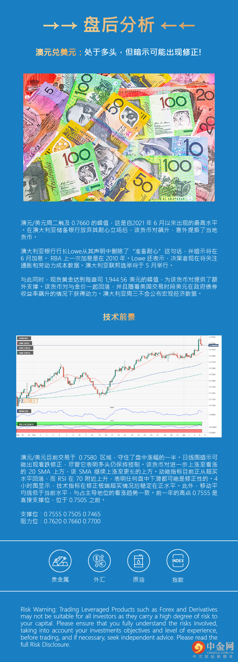 澳元/美元周二触及 0.7660 的峰值,这是自2021 年 6 月以來出现的最高水平。