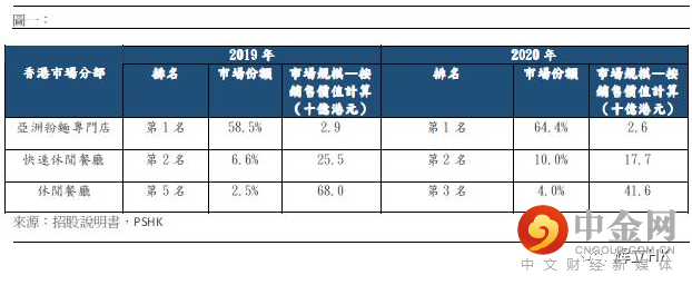 谭仔国际作为专营米线的连锁餐厅营运商,在香港亚洲粉面专门店市场具领先地位,市场占有率为64.4%(按2020年收益计算)。在香港的休闲餐厅市场及快速休闲餐厅市场亦稳居前位,市场份额于2020年在各分部都有显著提升,具有强势的竞争力。