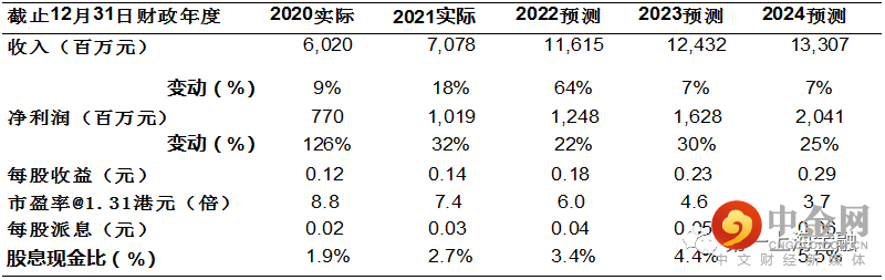 综上所述,我们预计2022-2024年公司有望实现收入116.2/124.3/133.1亿元,实现净利润12.5/16.3/20.4亿元,对应ESP分别为0.18/0.23/0.29元,并给予目标价1.76港元,相当于21财年盈利预测的8.1倍PE,距离当前股价有33.5%的增长空间,维持买入评级。