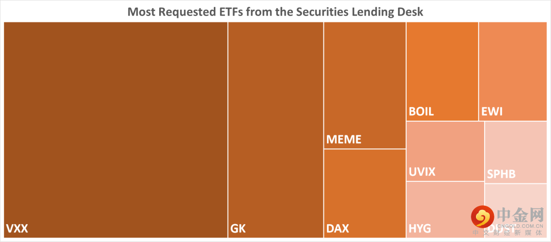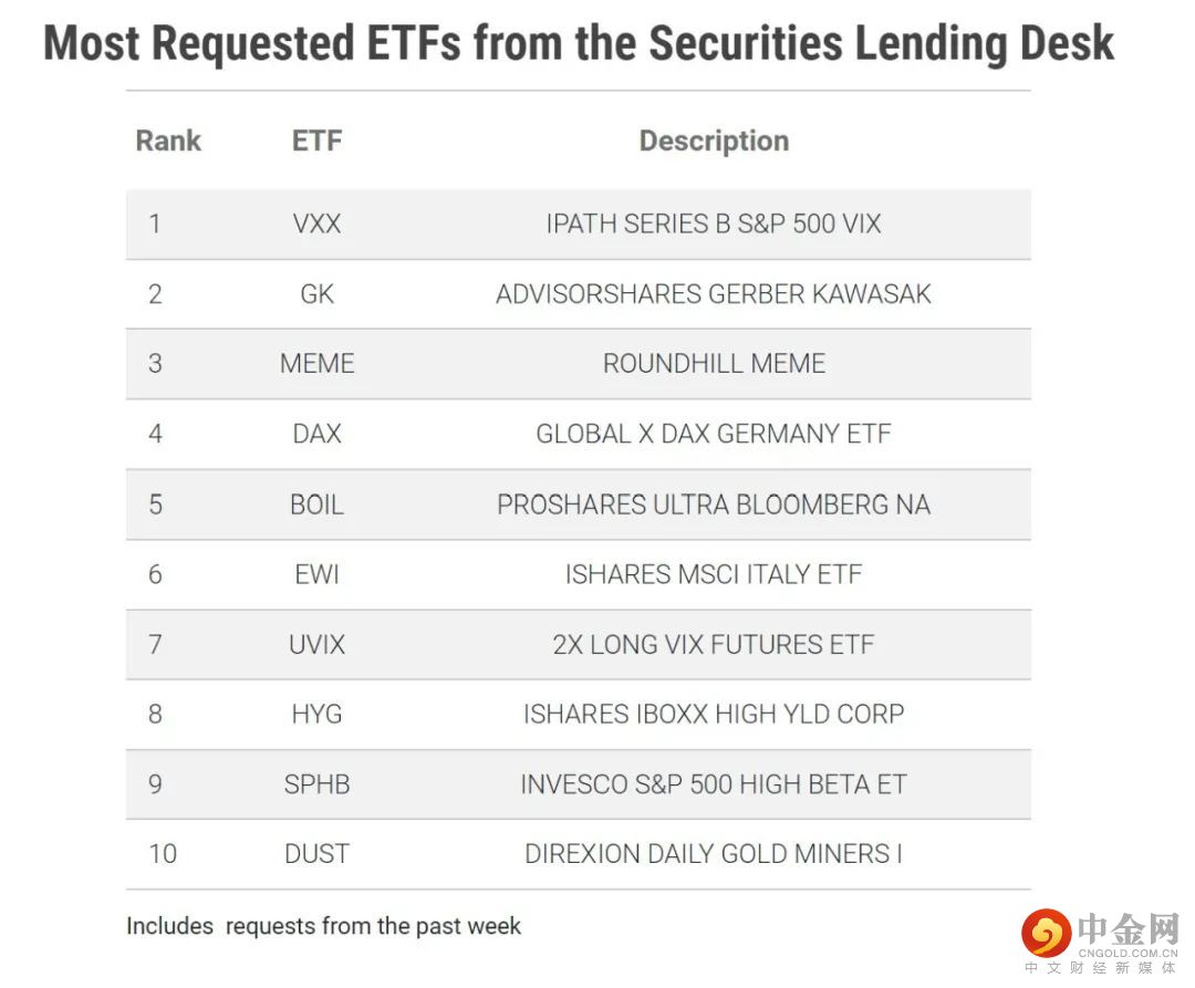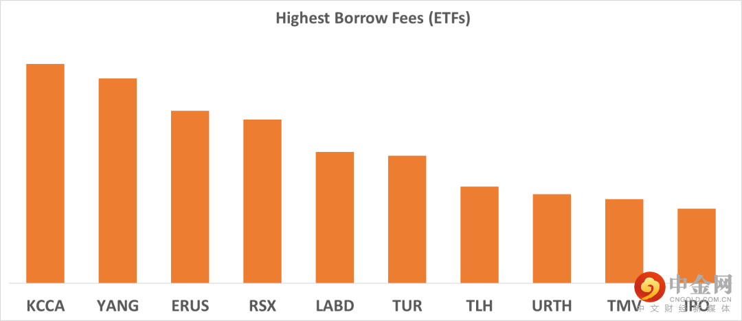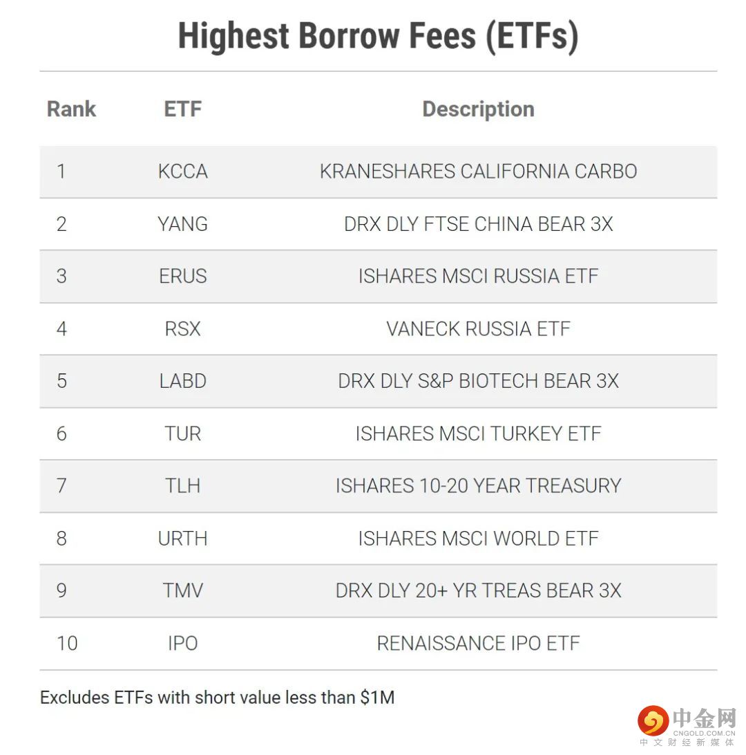 下表中列出的是2022/3/31具有最高借入费用的10个ETF。