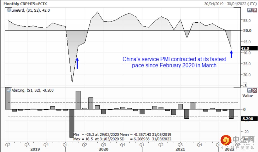 最近新冠病例数增加以及为了遏制疫情而随之展开的限制措施,拖累中国服务业活动。中国服务业PMI自50.2下跌至42,是2020年一季度疫情最严重时期以来最高收缩速度,8.2点的跌幅也是2021年8月以来最大月度跌幅。