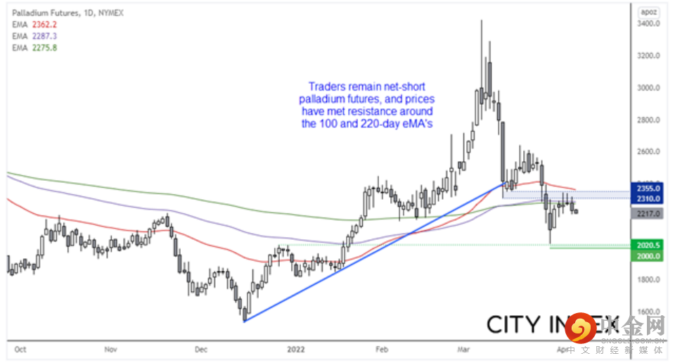 本周上涨的美元携手疲弱的中国PMI数据进一步打压钯金价格,并且期货市场的持仓仍为净空头。事实上,交易者过去三周增持空头头寸并减持多头持仓。