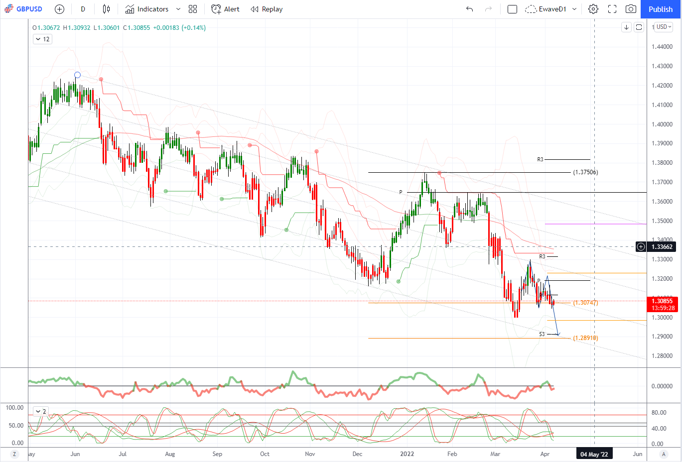 第一个主要支撑位 1.3001 2022 低点,然后是 1.2999 更低的 21 天波利波段