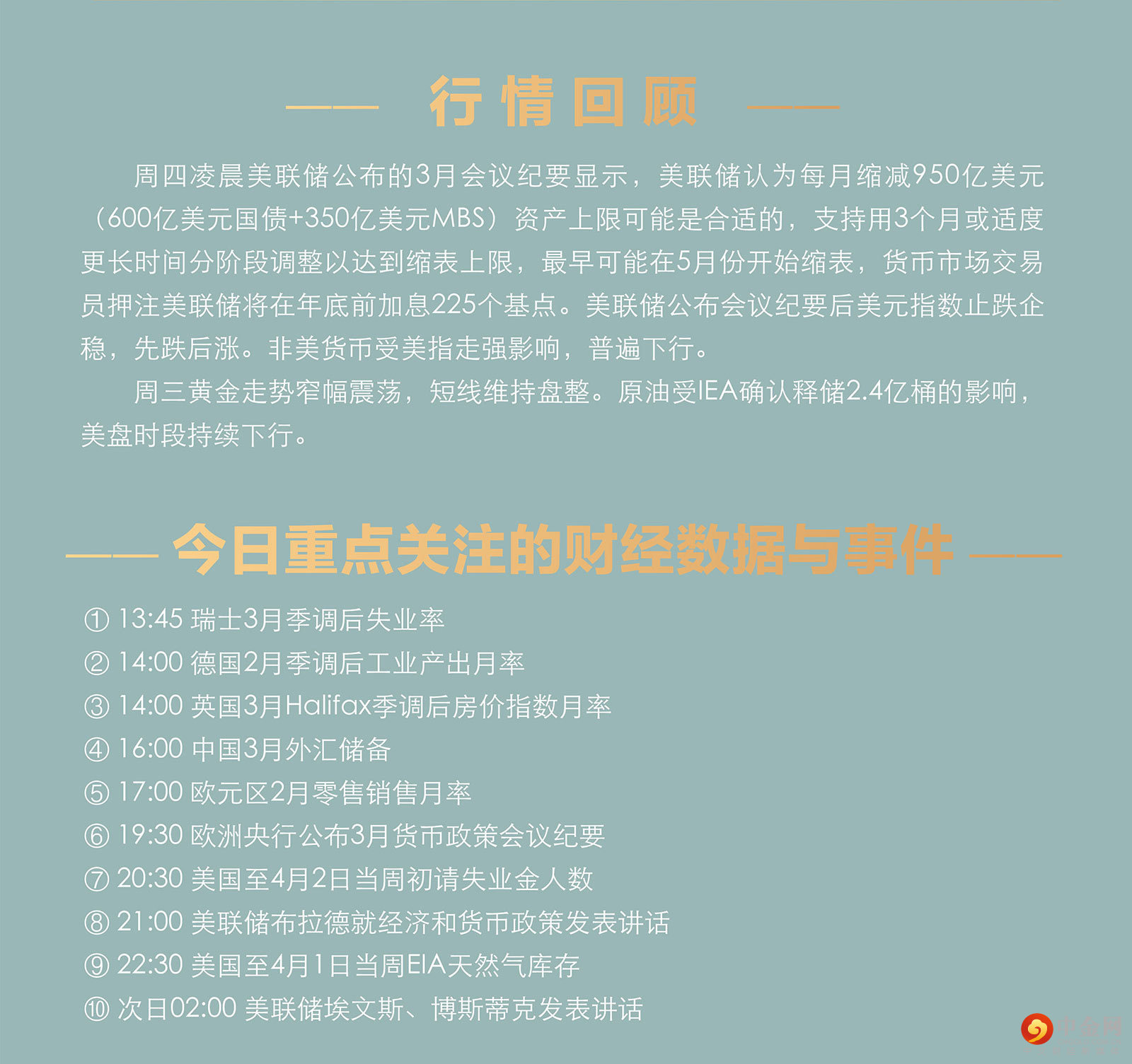 周四凌晨美联储公布的3月会议纪要显示,美联储认为每月缩减950亿美元(600亿美元国债+350亿美元MBS)资产上限可能是合适的,支持用3个月或适度更长时间分阶段调整以达到缩表上限,最早可能在5月份开始缩表,货币市场交易员押注美联储将在年底前加息225个基点。美联储公布会议纪要后美元指数止跌企稳,先跌后涨。非美货币受美指走强影响,普遍下行。 周三黄金走势窄幅震荡,短线维持盘整。原油受IEA确认释储2.4亿桶的影响,美盘时段持续下行。