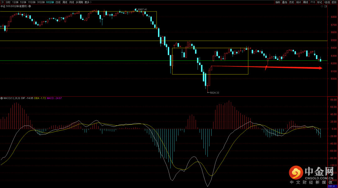 中证500短期可能会选择向下去回补前期的缺口。需要注意关注缺口回补后是否能够出现小级别的背驰结构,如果出现则还有再次向上试探6400点压制的可能性存在。如果无法出现则有再次探底的风险。