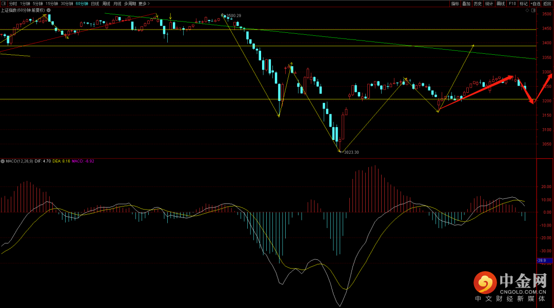 大盘低开后向上回补缺口,由于量能无法释放出现回落走势,短期需要注意3200点附近的支撑,由于六十分钟才刚出现调整如果出现再次快速的向上需要注意节奏,大概率会出现再次的回落走势。