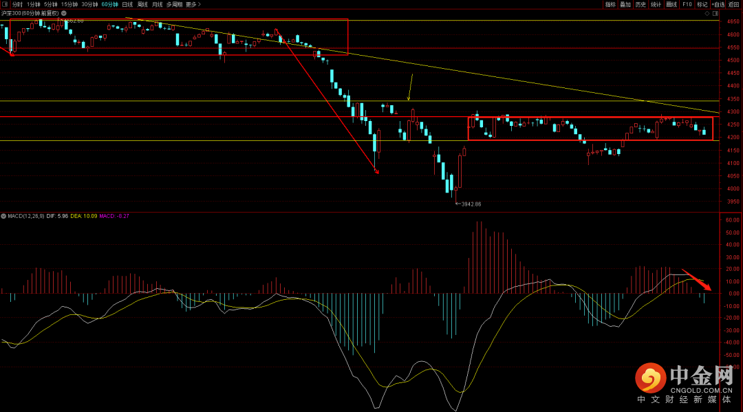 沪深300短期继续走区间震荡,这个结构往往属于弱势结构,需要注意是否会跌破4100点支撑,如果出现跌破则大概率会再次去试探前期低点附近的支撑,而上方压制从六十分钟的下降趋势线的结构看大概率就在4300点附近,这个位置没有量能的配合大概率是无法突破。