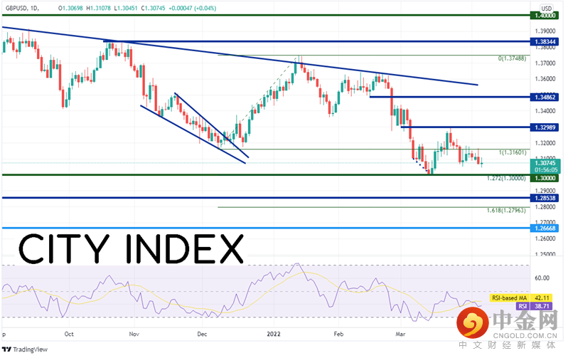 英镑/美元自1月13日在1.3788构筑短线高点后大幅度下跌,于3月14日考验了2021年12月8日低点到2022年1月13日高点行情的127.2%扩展位1.3000附近,但未能下破且反击1.3273附近的阻力位。该货币对眼下正在下挫,似乎再度考验1.3000。如果成功下破,可能先后下看2020年11月以来水平支撑位1.2854、前述行情的161.8%扩展位1.2793附近。阻力位在3月23日高点1.3298、水平阻力位1.3486。