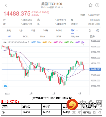 前一个交易日TECH100指数下跌-2.18%,收盘来到14505.25。