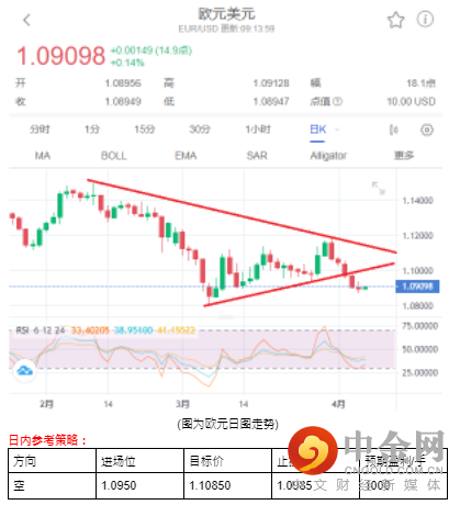 日图连续五天下跌,跌破1.08关口支撑,且刺穿3月9日大阳柱的低点,10及20日均线持续下行,短线仍在空头的压制中,与此同时,6日及12日相对强弱指标RSI在50以下,代表卖盘力道比买盘强势,故汇价不排除再创低位。
