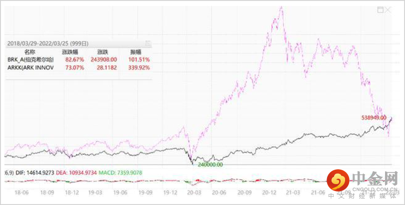 我们看看上面这张图就能知道,木头姐的收益曲线呈现出巨大的波动性,而巴菲特则呈现出惊人的稳定性。最后4年下来,ARK的涨幅只有73%,而伯克希尔的涨幅高达82%,看似保守的巴菲特,长期收益仍然跑赢了更激进的“木头姐”。