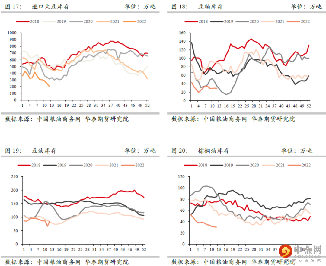 南美大豆出口份额的丢失,主要用过两方面来抵消。一方面是部分出口份额转移至美国,所以我们看到在3月报告中2021/22年度美豆出口从5580万吨上调至5680万吨,出口调增100万吨。另一方面,全球大豆进口需求被大幅下调,其中2021/22年度中国大豆进口需求从9700万吨下调至9400万吨,进口调减300万吨;非中国需求从6570万吨下调至6270万吨,出口调减300万吨。在4月USDA报告中我们有可能看到该调整趋势的进一步延续,也就是南美大豆产量继续小幅下调,同时美豆出口数据受益增长。我们预估4月报告2021/22年度美豆出口上调至2110百万蒲,同时期末库存降至266百万蒲。