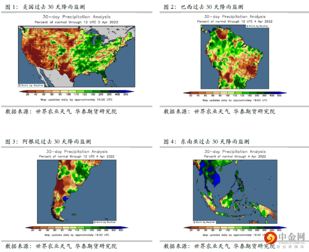 目前巴西大豆基本已经进入收割阶段尾声,因此其天气变化对本年度巴西大豆产量影响不大,阿根廷在3月份则继续保持降雨偏少状态,尤其科尔多瓦和圣菲区域偏干旱,对生长末期的大豆单产构成不利影响,进入4月份阿根廷大豆也开始进入收获阶段,预计后期产量仍有下调空间。