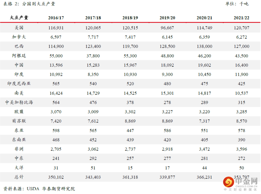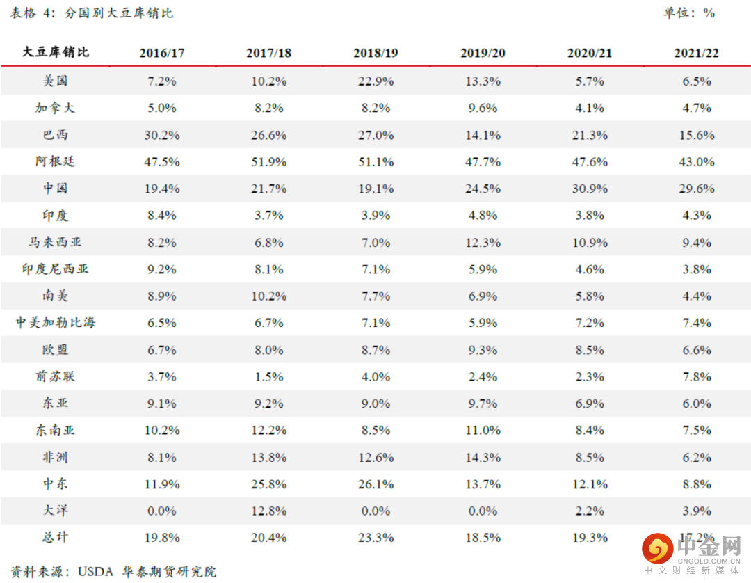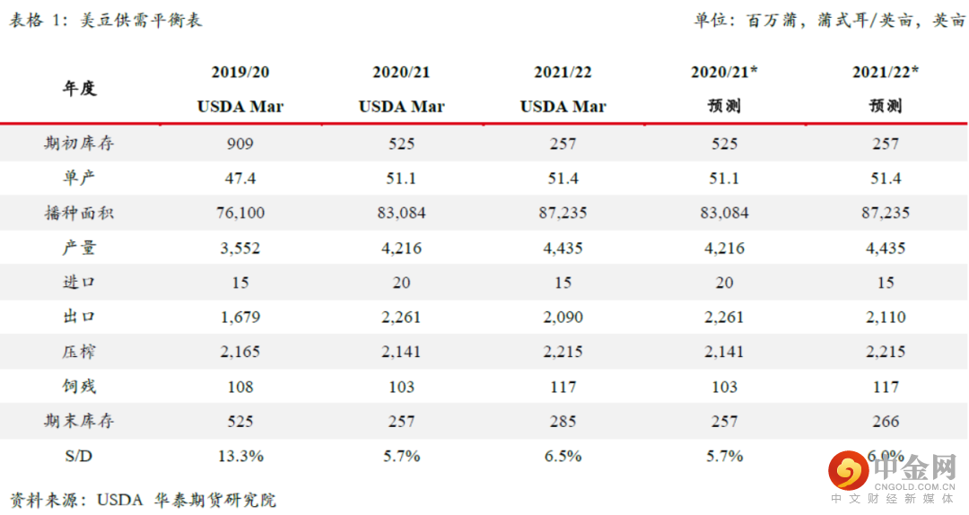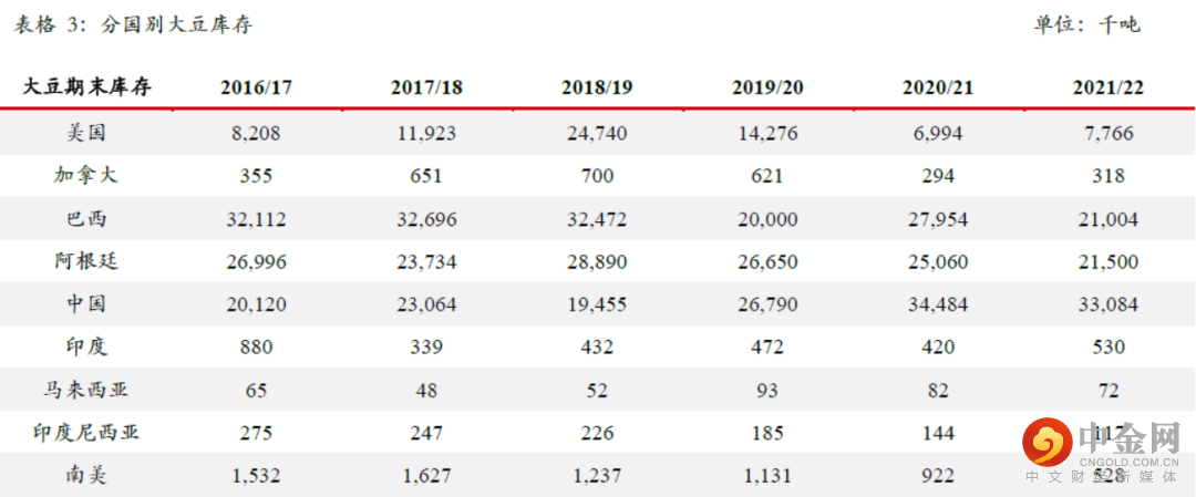 在3月USDA供需报告中,美国农业部对全球大豆供应和需求两端都做出了较大的调整。在3月报告中USDA将2021/22年度巴西大豆产量从1.34亿吨下调至1.27亿吨,产量调减700万吨;将阿根廷大豆产量从4500万吨下调至4350万吨,产量调减150万吨;将巴拉圭大豆产量从630万吨下调至530万吨,产量调减100万吨。3月报告中南美大豆产量合计调减950万吨。南美产量的大幅下调使得其出口能力被动下降,因此伴随而来的是南美大豆出口预估的相应调减。在3月报告中USDA将2021/22年度巴西大豆出口从9050万吨下调至8550万吨,出口调减500万吨;将阿根廷大豆出口从375万吨下调至275万吨,出口调减100万吨;将巴拉圭大豆出口从410万吨下调至360万吨,出口调减50万吨。南美大豆出口合计调减650万吨。因为受到产量下降的影响,所以我们看到南美大豆只能通过降出口和降库存的方式来保持其自身的供需平衡。