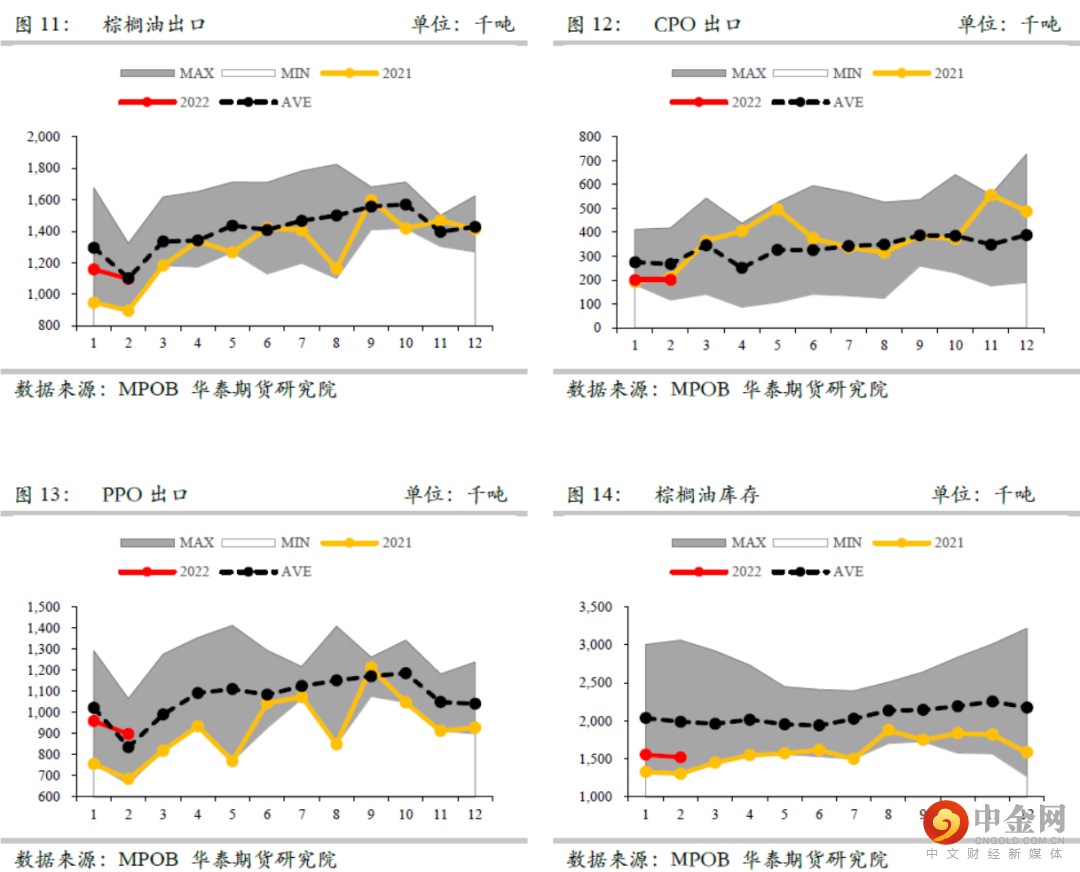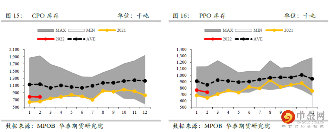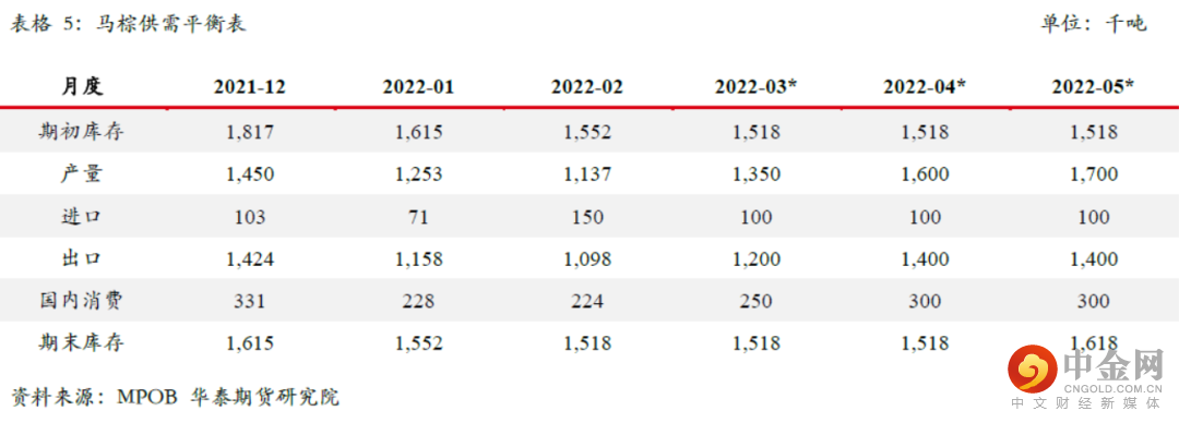 从二季度开始马棕产量开始进入每月产量环比上升的阶段,目前我们预估4-5月份产量分别在160万吨和170万吨。出口需求方面后期需重点关注印尼提高出口关税以及乌克兰葵油出口受阻对马棕出口数据的影响,目前我们预估4-5月份马棕出口分别在140万吨。按照当前预估推算下来,未来4-5月份马来西亚棕榈油库存将呈现小幅累库状态,预计到5月底马棕库存升至160万吨附近。