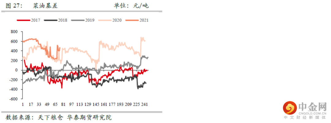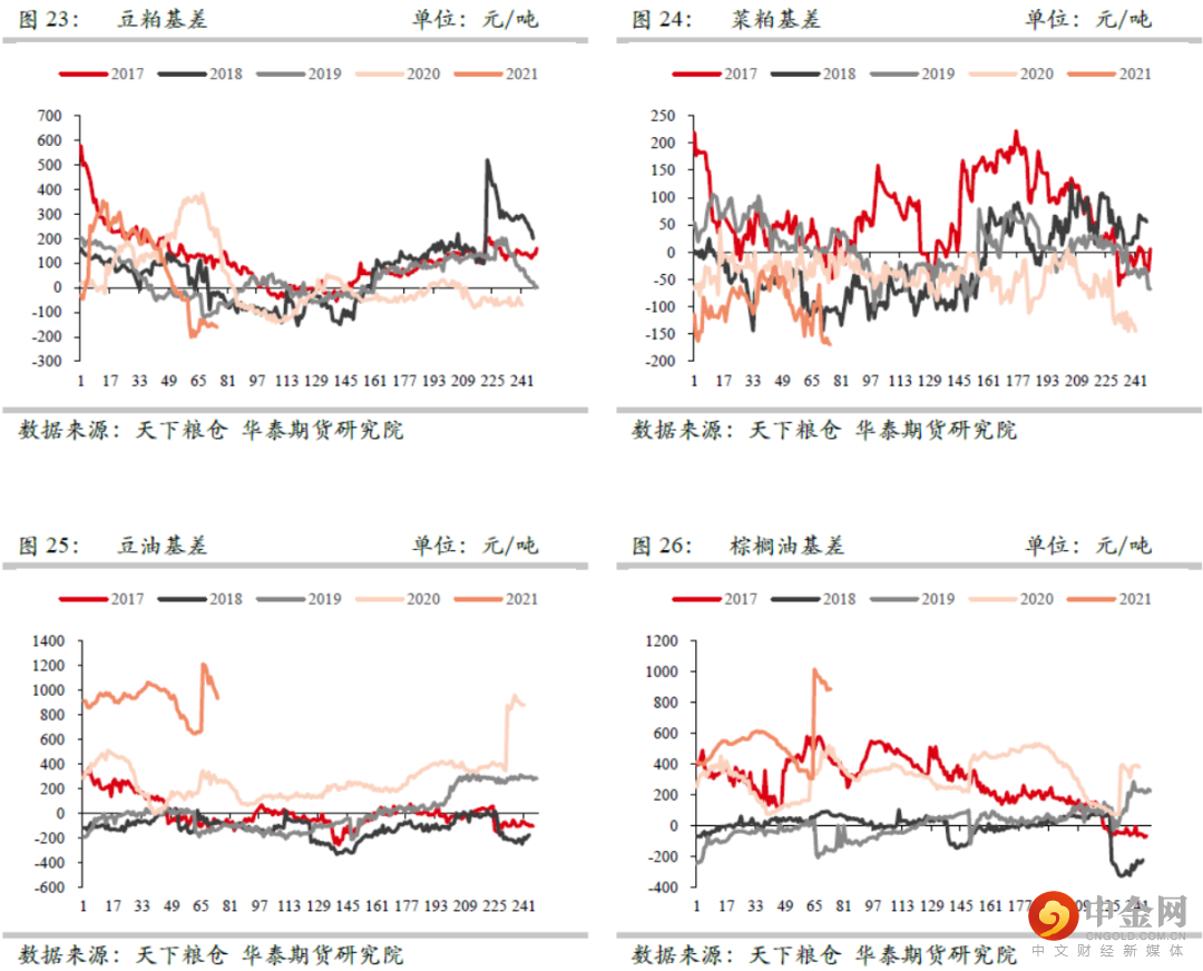 随着二季度进口大豆集中到港,再加抛储政策的影响,后期油厂开机水平提升,豆粕现货供应紧张局面阶段性缓解,同时在价格高位的情况下,下游终端逐步采用降低豆粕添加比例的方式来降低成本,使得短期豆粕消费表现低迷,豆粕现货基差自高位有所回落。目前华南豆粕基差M05+400,华南菜粕基差RM05+100。