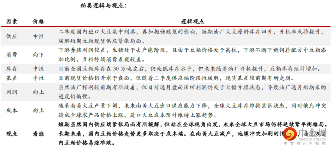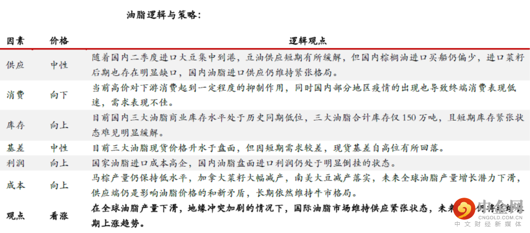 油脂:随着国内二季度进口大豆集中到港,豆油供应短期有所缓解,但国内棕榈油进口买船仍偏少,进口菜籽后期也存在明显缺口,国内油脂进口供应仍维持紧张格局。当前高价对下游消费起到一定程度的抑制作用,同时国内部分地区疫情的出现也导致终端消费表现低迷,需求表现不佳。目前国内三大油脂商业库存水平处于历史同期低位,三大油脂合计库存仅150万吨,且短期库存紧张状态难见明显缓解。目前三大油脂现货价格升水于盘面,但因短期需求较差,现货基差自高位有所回落。国家油脂进口成本高企,国内油脂盘面进口利润仍处于明显倒挂的状态。马棕产量仍保持低水平,加拿大菜籽大幅减产,南美大豆减产落实,未来全球油脂产量增长潜力下滑,供应端仍是影响油脂价格的和新矛盾,长期依然维持牛市格局。在全球油脂产量下滑,地缘冲突加剧的情况下,国际油脂市场维持供应紧张状态,未来价格仍将延续长期上涨趋势。