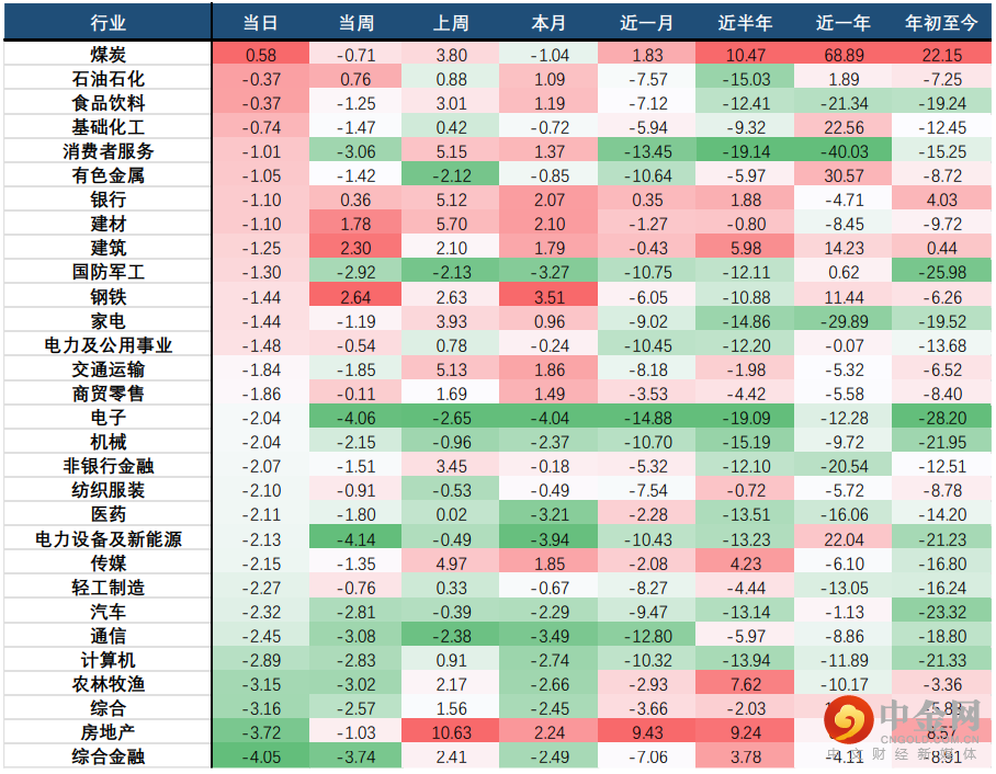 行业方面,当日30个中信一级行业中,仅有煤炭行业收涨,涨幅也仅有0.58%;而跌幅前三的行业为:综合金融(4.05%)、房地产(3.72%)、综合(3.16%)。